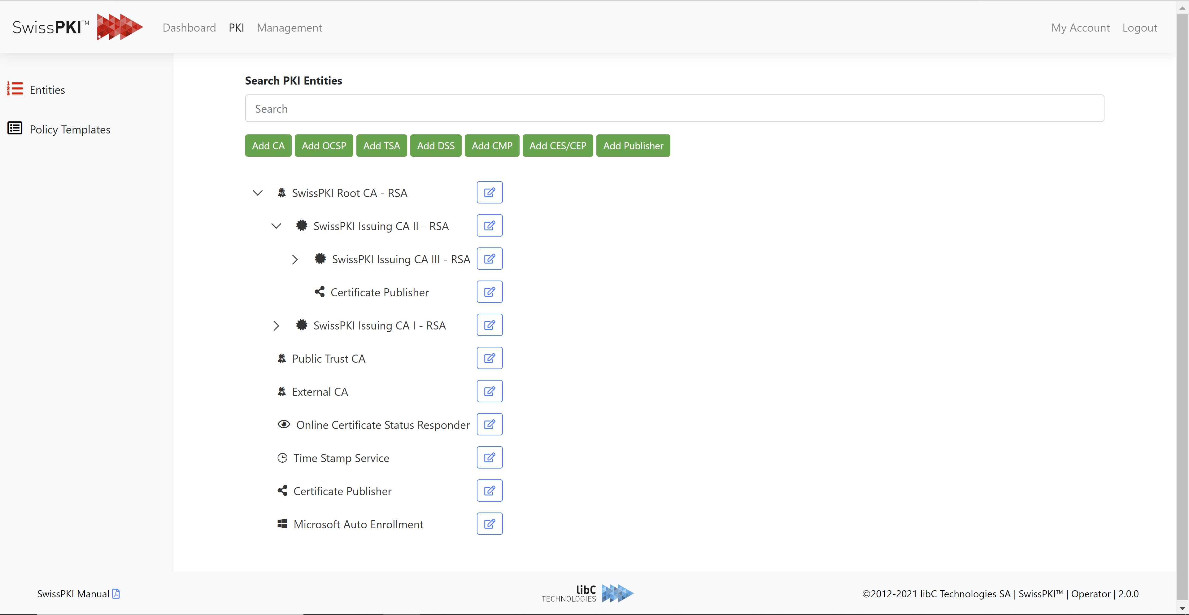 – JSON Web Token for REST APIAccess control to the SwissPKITM functionalities is managed through a standard PKI role based model backed up with a fine grained Create/Read/Update/Delete permission settings pattern controlled through permission templates which you can configure to your organization’s needs.