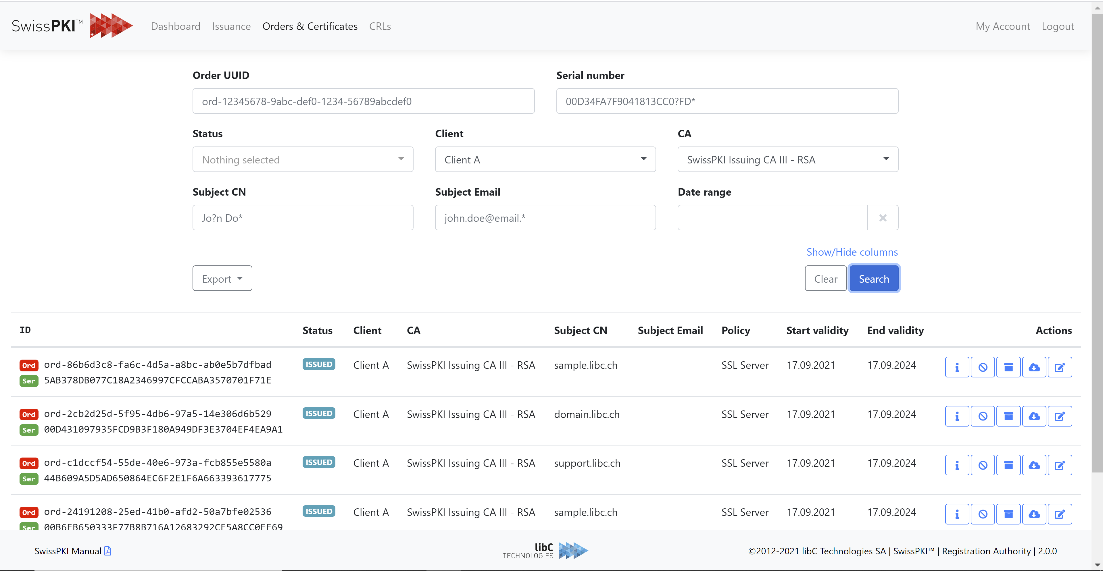 SwissPKITM lets you organize certificate registration, renewal and revocation workflows by combining optional authorization and notification rules.